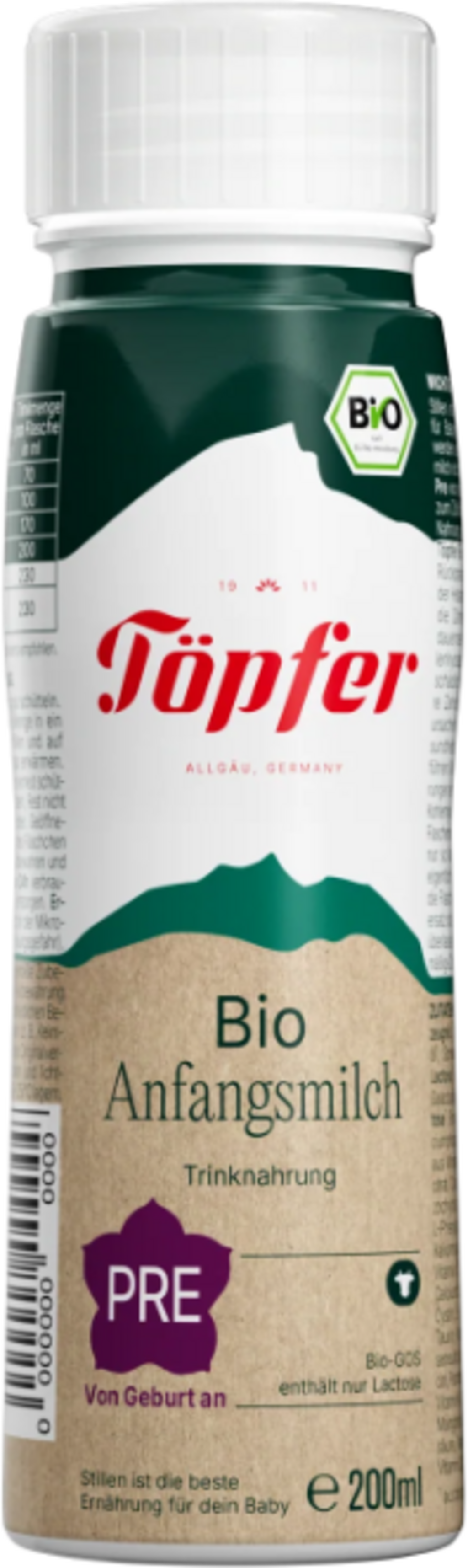 Den drickfärdiga ekologiska spädbarnsnäringen baserad på komjölk PRE från Töpfer ger ditt nyfödda barn optimala näringsämnen från första stund. Den är tillverkad av högkvalitativ ekologisk mjölk från Allgäu och är noggrant anpassad efter spädbarns speciella behov. Den kan användas både som komplement till amning och som ensam föda fram till slutet av flaskperioden.