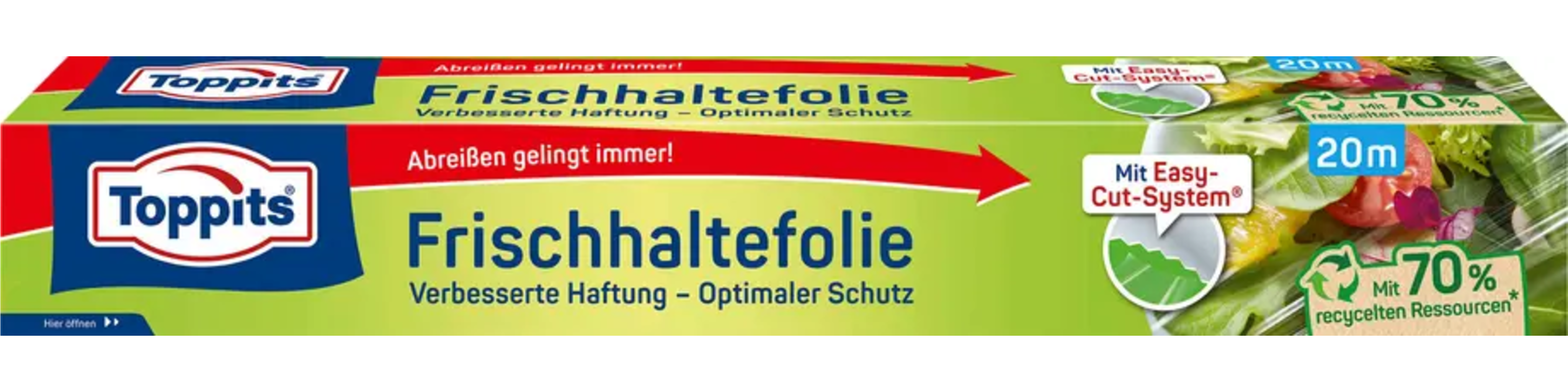Toppits plastfolie är en mångsidig och självhäftande folie som gör det enkelt att täcka över livsmedel snabbt och hygieniskt. Tack vare det praktiska Easy-Cut-System® kan den rivas av rakt och smidigt. Den följsamma 3-skikts-specialfolien hjälper till att bevara smak och näringsämnen längre samt minska oönskade lukter i kylskåpet. Med en enda rulle har du en genomtänkt vardagsprodukt som hör hemma i varje kök.