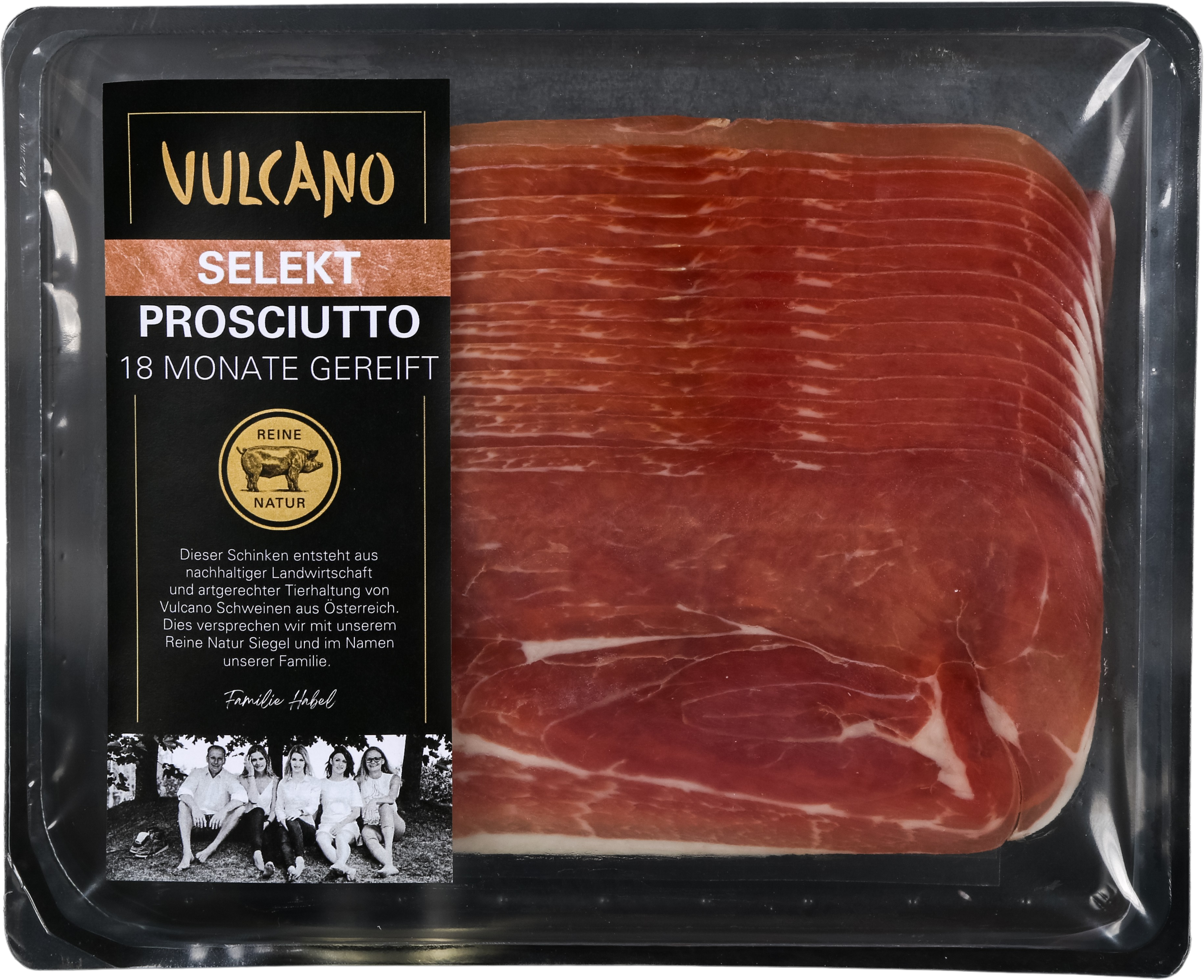 Den råa skinkan Vulcano Selekt imponerar med sitt mästerliga hantverk och kött av högsta kvalitet. den har mognat omsorgsfullt i 18 månader och utvecklar en unik smak - perfekt för kalla köttfat, raclette eller helt enkelt som den är på färskt bröd.