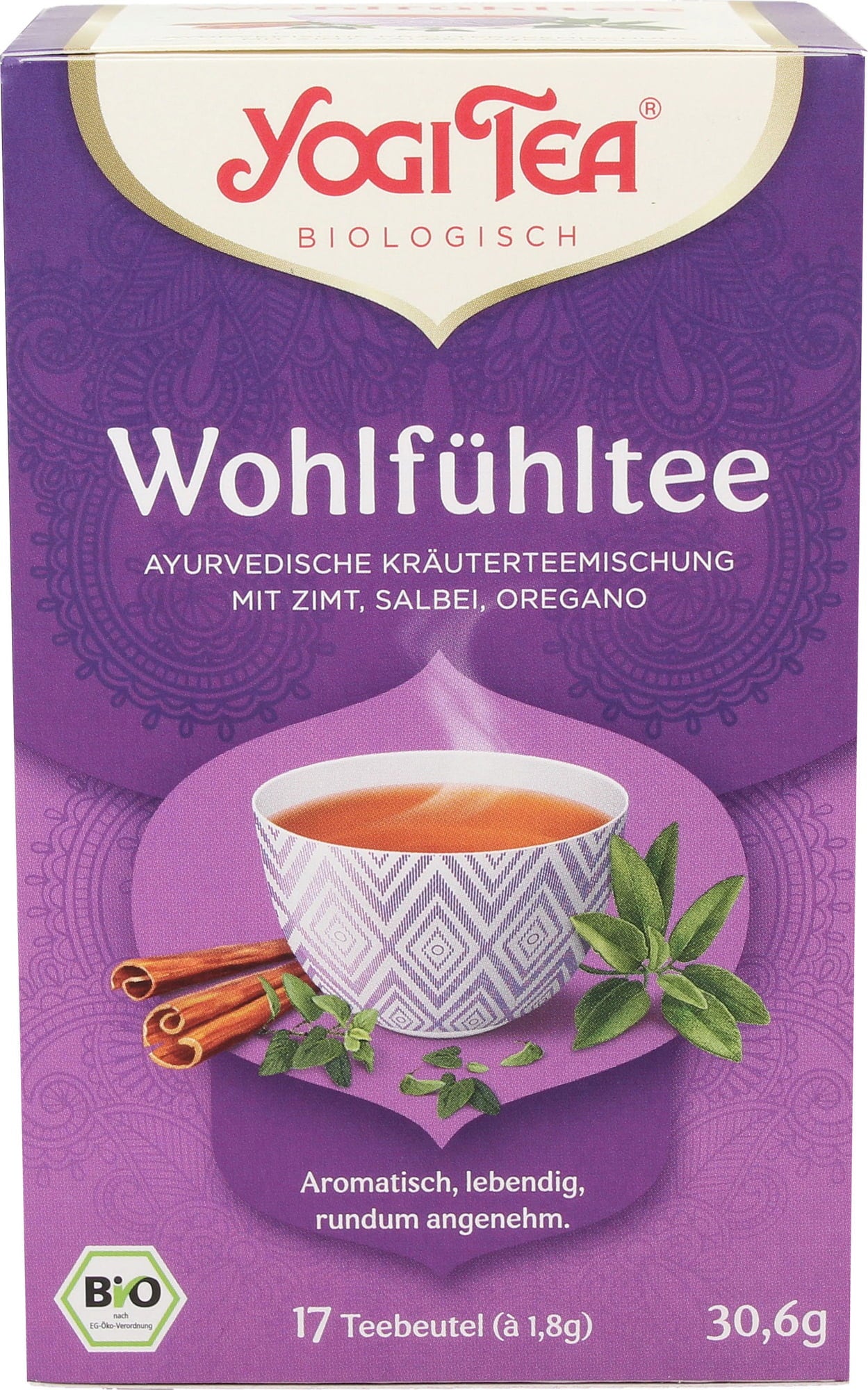 - Yogi Tea Välmående kombinerar örter från Medelhavet med ayurvedisk tradition. Den kryddiga doften och fylliga smaken av salvia & oregano, tillsammans med kanel & citronverbena, för tankarna till en solnedgång vid havet. En kopp som får dig att stråla inifrån.