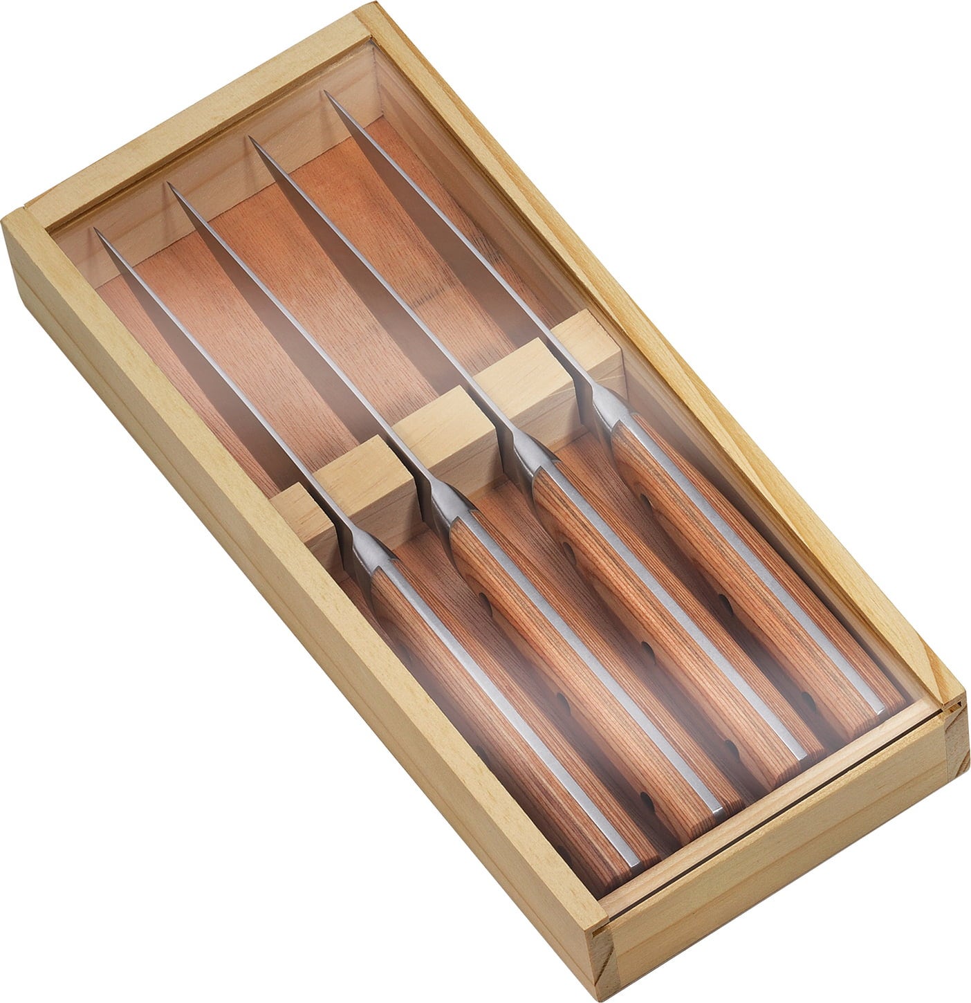 Med ZASSENHAUS stekknivset lyfts varje steak till nya höjder. De släta bladen i specialstål ger precisa snitt, medan handtagen i pakkaträ ger ett säkert och bekvämt grepp. Varje kniv är unik tack vare träets naturliga variationer i färg och ådring. Setet levereras i en elegant trälåda.