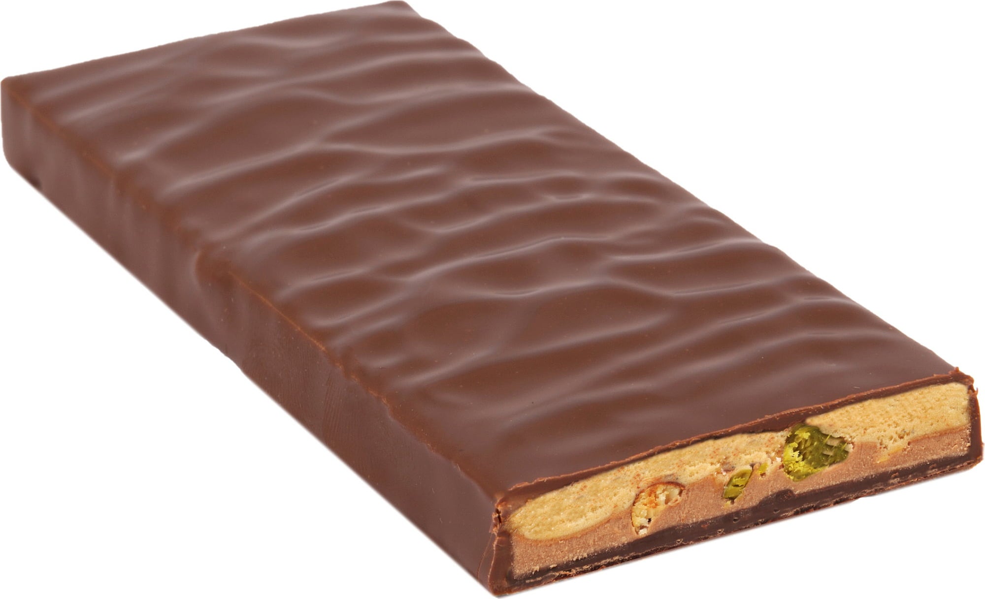 Fransk vit nougat är inte lätt att göra, men en sann delikatess. Zotter antar utmaningen och tillverkar denna söta snö själv. Förfinad med hackade pistagenötter och hasselnötter, samt ett lager mandelnougat och ett lent mjölkchokladöverdrag med 60 % kakaohalt.