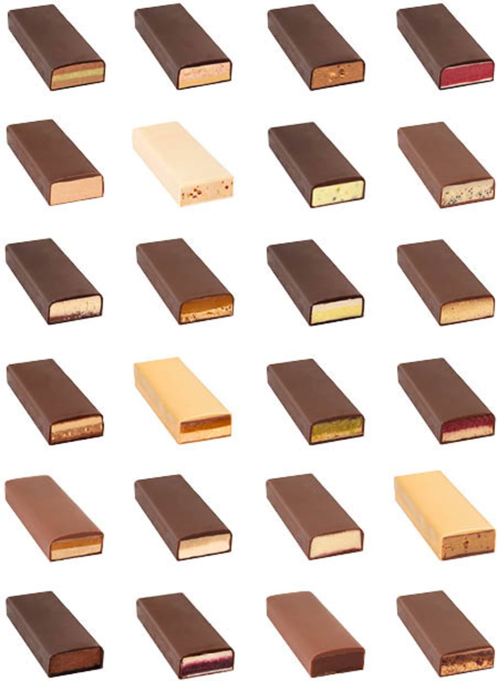 Rohrohrzucker[1], Kakaosmör[1], Kakaomassa[1], Mandeln[2], Mjölkpulver[2], Butter[2], Invertzuckersirup[2], Marsipan[2] (Mandeln[2], Zucker[2], Invertzuckersirup[2]), Helmjölk[2], Haselnüsse[1], Skummjölkspulver[2], grädde[2], Hanfsamen[2], karamelliserat mjölkpulver[2] (Skummjölkspulver[2], Zucker[2]), Stärkelse sirap[2], Sött vasslepulver[2], Pekannüsse[2], Plommon, torkade[2], Karamellchips med honung[2] (Rohrohrzucker[2], Glukossirap[2], Butter[2], Honung[2], Meersalz, Emulgator[2] (sojalecitin)), Datteln[2], Lönnsocker[2], Vollrohrzucker[1], Cognac[2], Massa av hallon[2], Krisp med karamell[2] (Rohrohrzucker[2], Glukossirap[2], Butter[2], Meersalz, Emulgator (sojalecitin[2])), Reisdrinkpulver[2] (Ris[2], Solrosolja[2], Salt), Pumpakärnor[2], Frystorkade hallon[2], Pistazien[2], Heidelbeeren[2], Walnüsse[2], Marc de Champagne[2], Blaumohn[2], Solrosolja[2], Våffelbitar[2] (Vetemjöl[2], Zucker[2], Butter[2], Skummjölkspulver[2], extrakt av kornmalt[2], Salt), Rom[1], Bananer, frystorkade[2], Kokosraspel[1], Zitronensaft[2], Honung[2], Whisky[2], Citroner frystorkade[2] (Zucker[2], Zitronensaftkonzentrat[2], Mango[2], Stärkelse[2]), Emulgator (sojalecitin[2], Mangopuré[2], Äpple Brandy[2], Zitronensaftkonzentrat[2], Mango torkad[2], Frystorkade blåbär[2], Kokosmjölk[2], Pulver av hallon[2], Erdbeeren[2], Roggenmehl[2], Bergsalt, Koncentrat av ananasjuice[2], Eigelb[2], Malet kaffe[1], Magermilchjoghurtpulver[2], Mandelolja[2], Zitronenpulver[2] (Zitronensaftkonzentrat[2], Majsstärkelse[2], Zucker[2])), Vaniljpulver[1], Kokospulver[2] (Kokosnötpasta[2], Kokosnussmilch[2], Kokosmehl[2]), Koncentrat av tranbär[2], Johannisbeersaftkonzentrat[2], Dadelsirap[2], Cashews[1], Konjak av körsbär[2], Hela ägg[2], Frystorkade röda vinbär[2], frystorkade jordgubbar[2], Hasselnötsolja[2], Lebkuchengewürz[2], anis[2], Kaffeepulver[1], Kanel[1], apelsinjuicekoncentrat[2], Backtriebmittel (Soda för bordsbruk), Rosblad[2], Kurkuma (Curcuma longa)[2], Emulgator (Lecitin från solrosfrön[2]), Ingwer Pulver[2], Kardamom (Elettaria cardamomum)[2], Orangenöl[2], Sternanis[2], Chilli från fågelöga[2], 70 % minst kakao i mörk choklad, 60 % mindestens in der extradunklen Milchschokolade, 50 % Kakao mindestens in der dunklen Milchschokolade, 40 % mindestens in der Milchschokolade