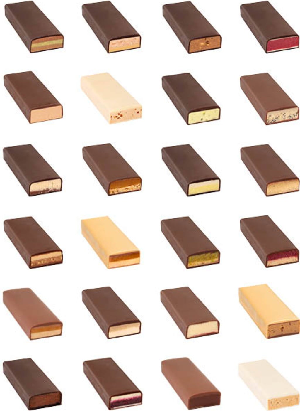 Rohrohrzucker[1], Kakaosmör[1], Kakaomassa[1], Mandeln[2], Mjölkpulver[2], Butter[2], Invertzuckersirup[2], Marsipan[2] (Mandeln[2], Zucker[2], Invertzuckersirup[2]), Helmjölk[2], Haselnüsse[1], Skummjölkspulver[2], Reisdrinkpulver[2] (Ris[2], Solrosolja[2], Salt), grädde[2], Hanfsamen[2], karamelliserat mjölkpulver[2] (Skummjölkspulver[2], Zucker[2]), Stärkelse sirap[2], Pekannüsse[2], Sött vasslepulver[2], Karamellchips med honung[2] (Rohrohrzucker[2], Glukossirap[2], Butter[2], Honung[2], Meersalz, Emulgator (Sojalecithin[2])), Lönnsocker[2], Cognac[2], Vollrohrzucker[1], Massa av hallon[2], Krisp med karamell[2] (Rohrohrzucker[2], Glukossirap[2], Butter[2], Meersalz, Emulgator (Sojalecithin[2])), Pumpakärnor[2], Frystorkade hallon[2], Pistazien[2], Heidelbeeren[2], Walnüsse[2], Marc de Champagne[2], Blaumohn[2], Solrosolja[2], Waffelkrokant[2] (Vetemjöl[2], Zucker[2], Butter[2], Skummjölkspulver[2], extrakt av kornmalt[2], Salt), Rom[1], Bananer, frystorkade[2], Kokosraspel[1], Zitronensaft[2], Mandelolja[2], Honung[2], Whisky[2], Citroner frystorkade[2] (Zucker[2], Zitronensaftkonzentrat[2], Mango[2], Stärkelse[2]), Mangopuré[2], Emulgator (Sojalecithin[2]), Äpple Brandy[2], Zitronensaftkonzentrat[2], Mango torkad[2], Frystorkade blåbär[2], Kokosmjölk[2], Flingor av majs[2] (Majsflingor[2], Frigöringsmedel[2] (Solroslecitiner[2])), Pulver av hallon[2], Erdbeeren[2], Bergsalt[2], Koncentrat av ananasjuice[2], Eigelb[2], Malet kaffe[1], Magermilchjoghurtpulver[2], Zitronenpulver[2] (Zitronensaftkonzentrat[2], Majsstärkelse[2], Zucker[2]), Vaniljpulver[1], Kokospulver[2] (Kokosnötpasta[2], Kokosnussmilch[2], Kokosmehl[2]), Johannisbeersaftkonzentrat[2], Koncentrat av tranbär[2], Cashews[1], Konjak av körsbär[2], Frystorkade röda vinbär[2], frystorkade jordgubbar[2], Hasselnötsolja[2], anis[2], Kaffeepulver[1], Emulgator (Solroslecitin[2]), Kanel[1], Rosblad[2], Kurkuma (Curcuma longa)[2], Ingwer Pulver[2], Kardamom (Elettaria cardamomum)[2], Sternanis[2], Chilli från fågelöga[2], 70 % minst kakao i mörk choklad[2], 60 % minst kakao i den extra mörka mjölkchokladen[2], 50 % minst kakao i det mörka mjölkchokladägget[2], 40 % minst kakao i mjölkchoklad[2]