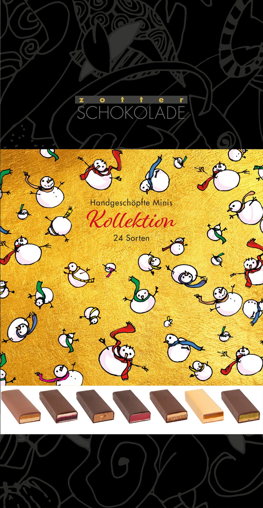 24 olika chokladsmaker, 24 unika njutningsstunder. Denna minikollektion ger en utsökt inblick i mångfalden av Zotters handgjorda choklader. Presentasken är dekorerad med ett julband och passar perfekt som gåva.