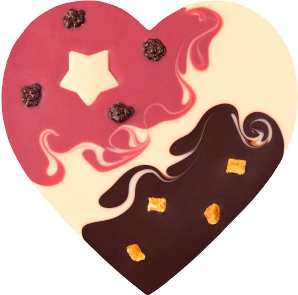 Ett läckert chokladhjärta inför julen, bestående av tre veganska smaker: hallon-kokos-kuvert, vit ris-kuvert och högprocentig mörk choklad med 80% kakaohalt. Toppat med söta delikatesser för ännu mer smakvariation.