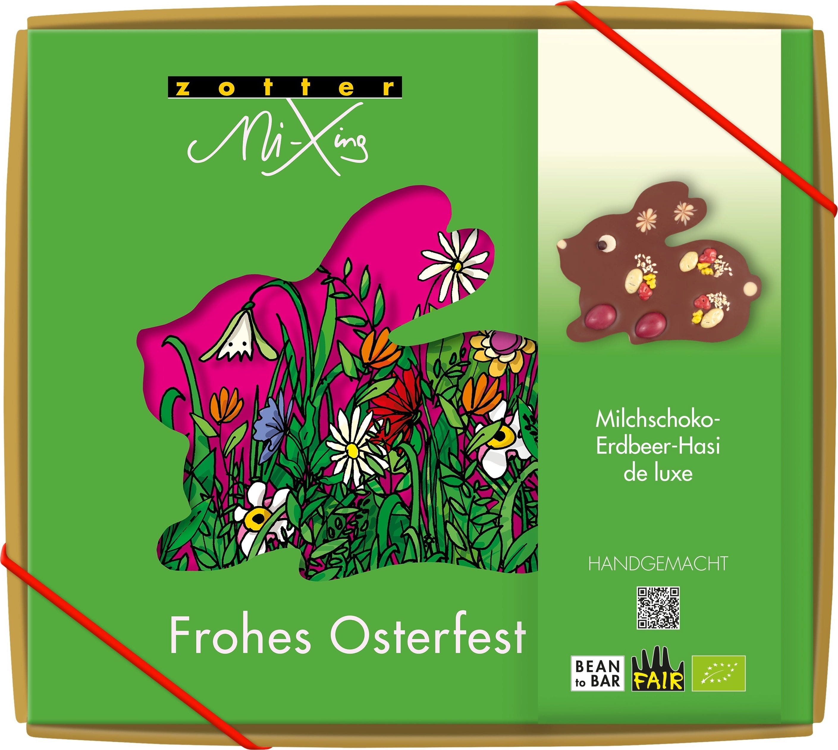Mjölkchoklad Jordgubb Bunny de Luxe från Zotter är en kärleksfullt utformad chokladskapelse, perfekt för påsktiden eller som en speciell present till chokladfans. Den skickligt utformade figuren är gjord av mjölkchoklad som smälter i munnen och fylld med en fruktig, aromatisk jordgubbskräm. Färgglada, naturliga dekorationer av frukt, rostade frön och vita chokladelement ger smak och visuella accenter och gör varje tugga till en upplevelse full av variation.
