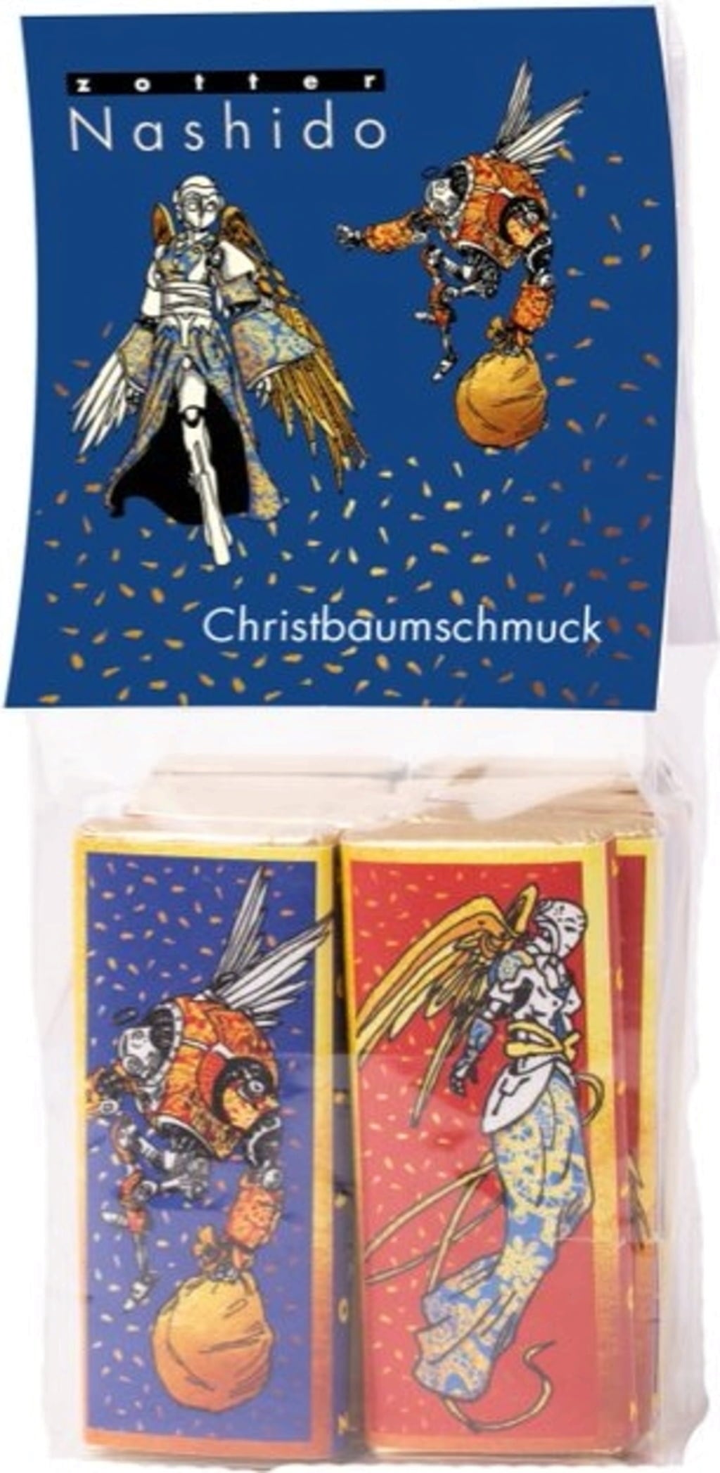 Julgranspynt med en twist: årets förpackning pryds av robotänglar! Setet innehåller 10 tunna Nashido-chokladkakor i två smaker (5 av varje, à 8,5 g):