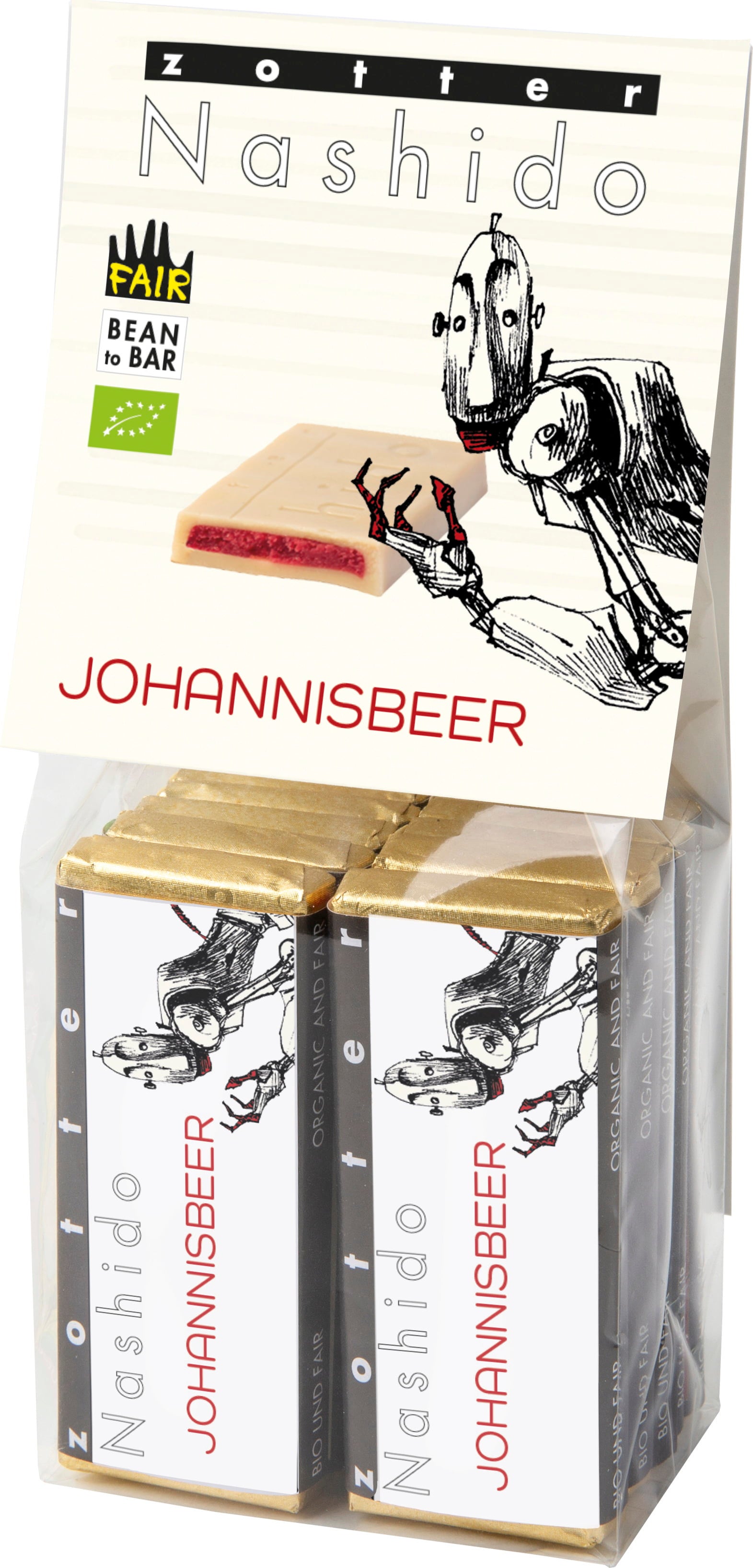 Detta set består av 10 bars på 8,5 g vardera. Den finaste vita chokladen täcker en fruktig fyllning av färska vinbär och smakar behagligt syrligt. Den intensiva färgen kommer naturligt från den höga andelen bär.
