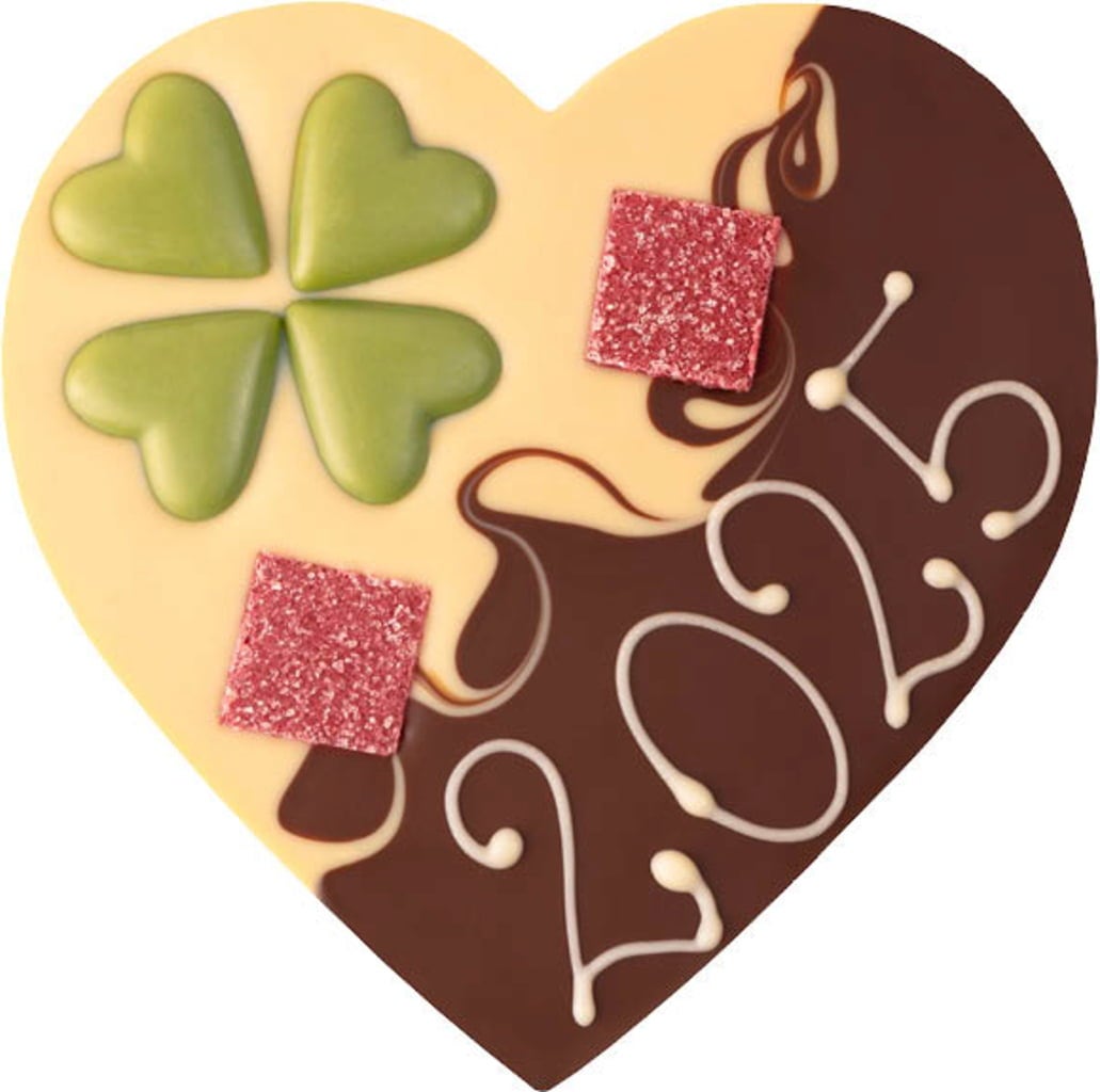 Bästa önskningar inför det nya året - läckra hälsningar från hjärtat! Basen utgörs av vit choklad och mjölkchoklad med 50% kakaohalt. Detta chokladhjärta är dekorerat med årtalet skrivet i risöverdrag, hjärtan av grönt te och glittrande rutor av delikat hallon-kokosöverdrag. Alla färger är naturliga och härrör uteslutande från de ingredienser som används.