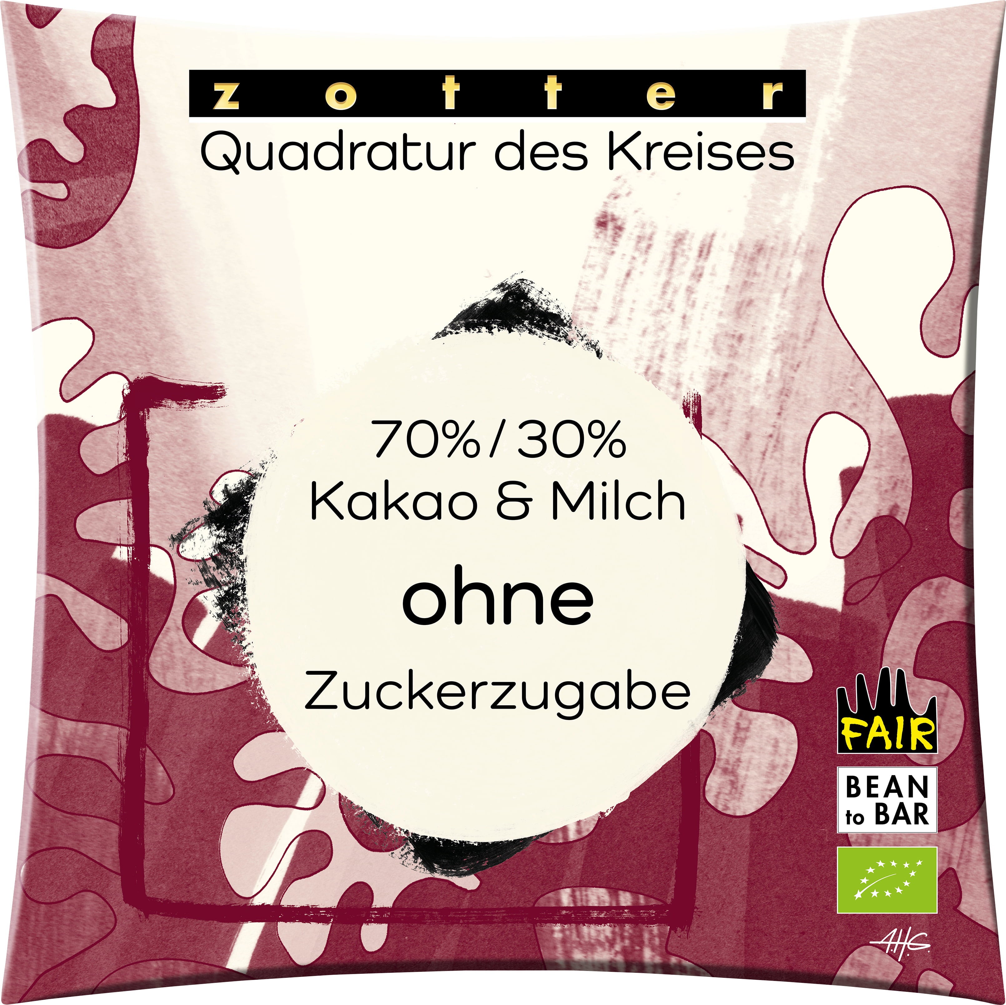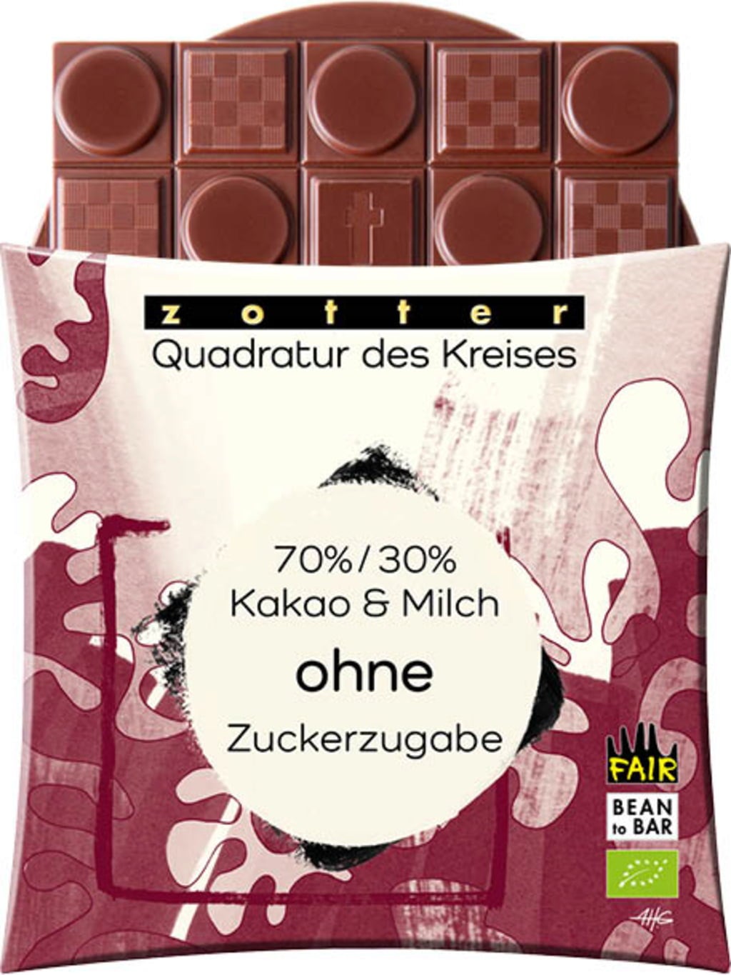 Zotter Schokoladen Quadrature of the Circle 70%/30% Mjölkchoklad utan Tillsatt Socker Ekologisk, 70 g