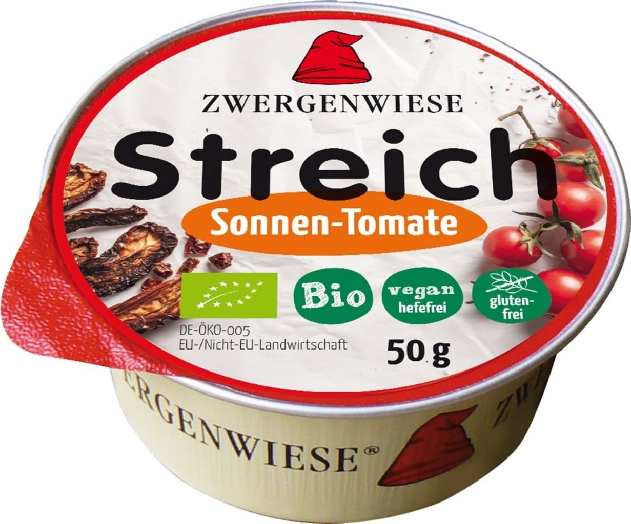 Sonnen-Tomate från Zwergenwiese är ett smörgåspålägg som passar perfekt för ett snabbt mellanmål. Tomatpuré och soltorkade tomater ger pålägget en härligt somrig smak. Alla ingredienser är ekologiska samt fria från både gluten och jäst.