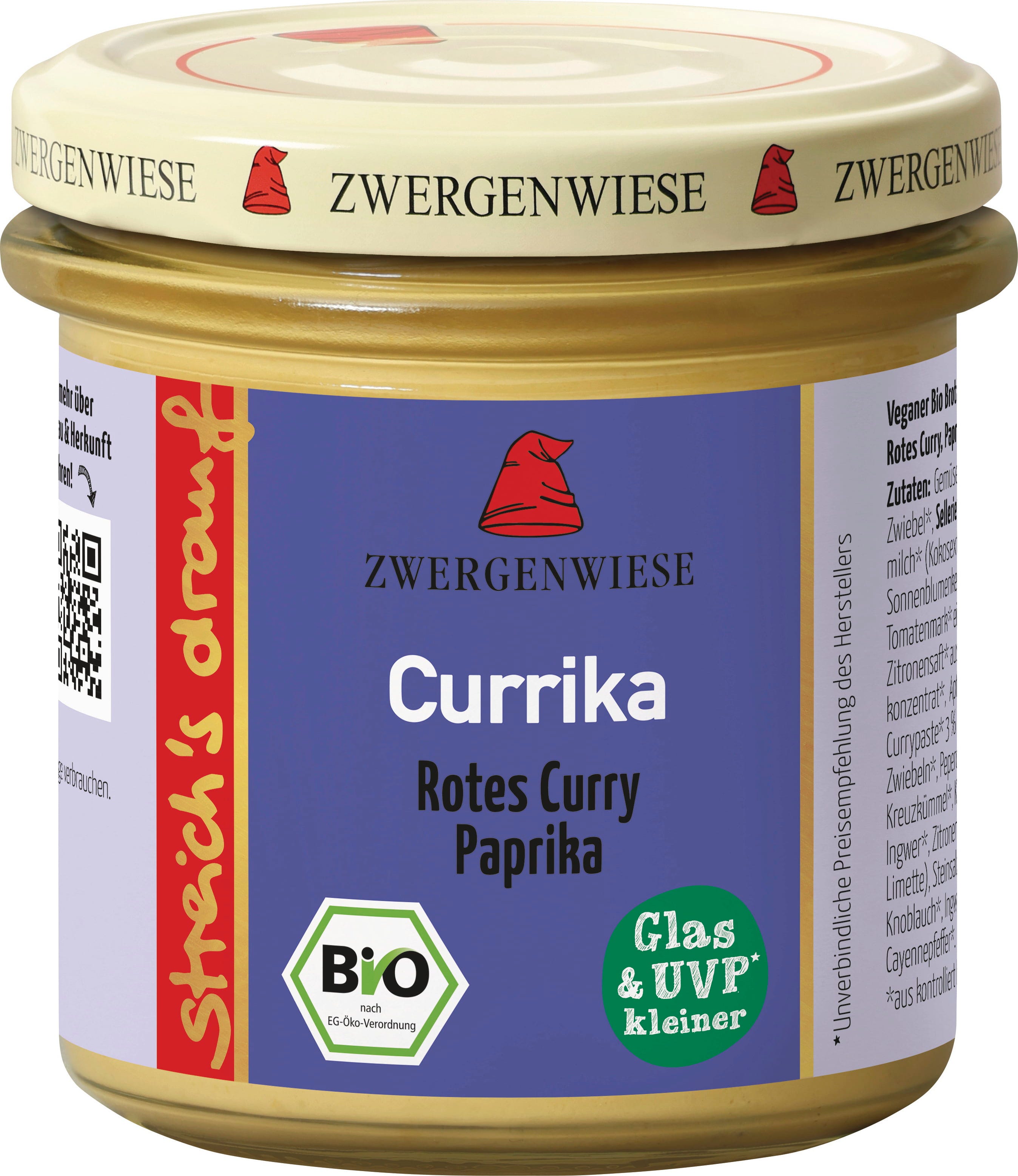Bio Streich’s drauf Currika från Zwergenwiese är ett kryddigt smörgåspålägg med röd curry och paprika. Smaksatt med en spännande blandning av exotiska kryddor som spiskummin, citronmyrten, kaffir-lime och ingefära. Perfekt för dig som älskar intensiv och pikant smak på mackan!