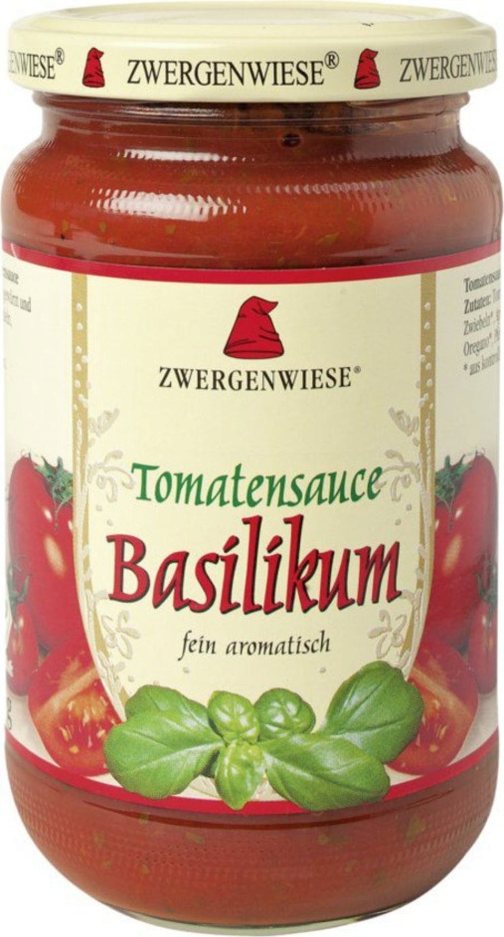 Den ekologiska tomatsåsen Basilika från Zwergenwiese är en mild och smakrik färdigsås, förfinad med färsk basilika, lök och oregano. Denna klassiker är tillverkad helt av ekologiska råvaror och helt fri från konstgjorda tillsatser. Perfekt för snabb, god matlagning med gott samvete.